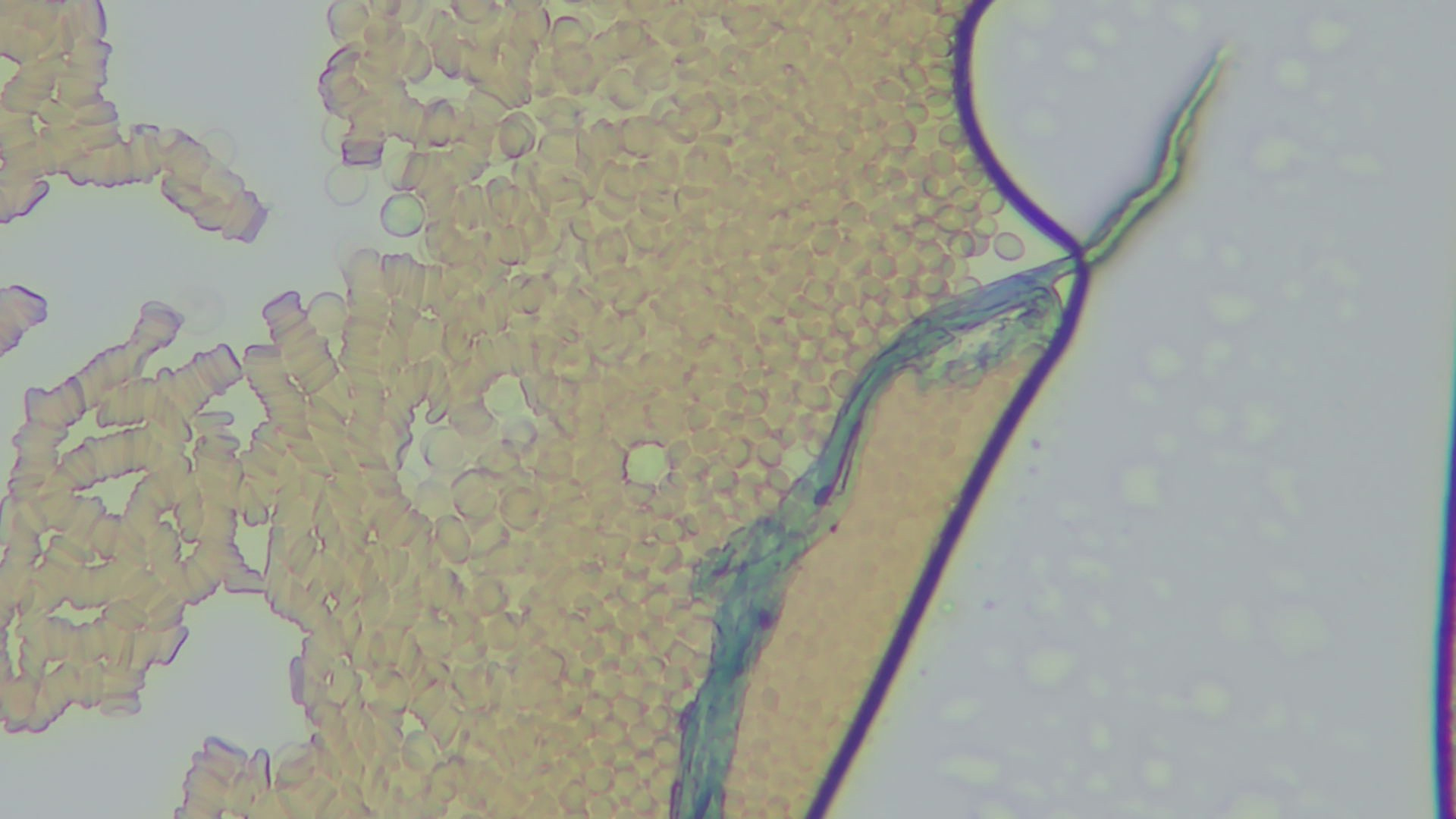 I can’t explain the void to the right. However, here is the link to Matt’s video of a fibre lassoing a bubble, sucking RBCs inside and crushing them into an orange goo: