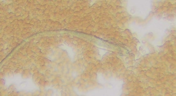One strand and seven crystal-like objects can be seen above. What the crystal-like objects are has become a subject of debate. According to my training in Live Blood Analysis, the shapes seen above are Protoplasts: collections of waste, fat and protein that that body hasn’t been able to eliminate. Recently, however, microscopy researchers, like Dr. Ana Mihalcea, have linked some objects like this to forms of nanotechnology. (See Dr. Ana Mihalcea’s April 27, 2024 Substack article, entitled: “Darkfield Live Blood Microscopy Of A Discoid Mesogen Self Assembly Nanotechnology Device In C19 Unvaccinated Blood”
