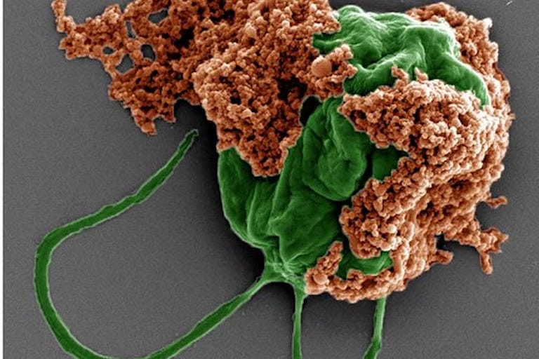 Algae-based microbots have been developed for various medical purposes, and some have red and green bits. The first article I came across on this topic described a biohybrid micro robot that consisted of live algae, combined with “nanoparticles coated with red blood cell membranes” The red blood cell membranes are used to trick the immune system into thinking the microbot is natural, so it doesn’t get attacked (Li, Zhengxing “Microrobots made of algae carry chemo directly to lung tumors, improving cancer treatment” THE CONVERATION 12 June 2024.)